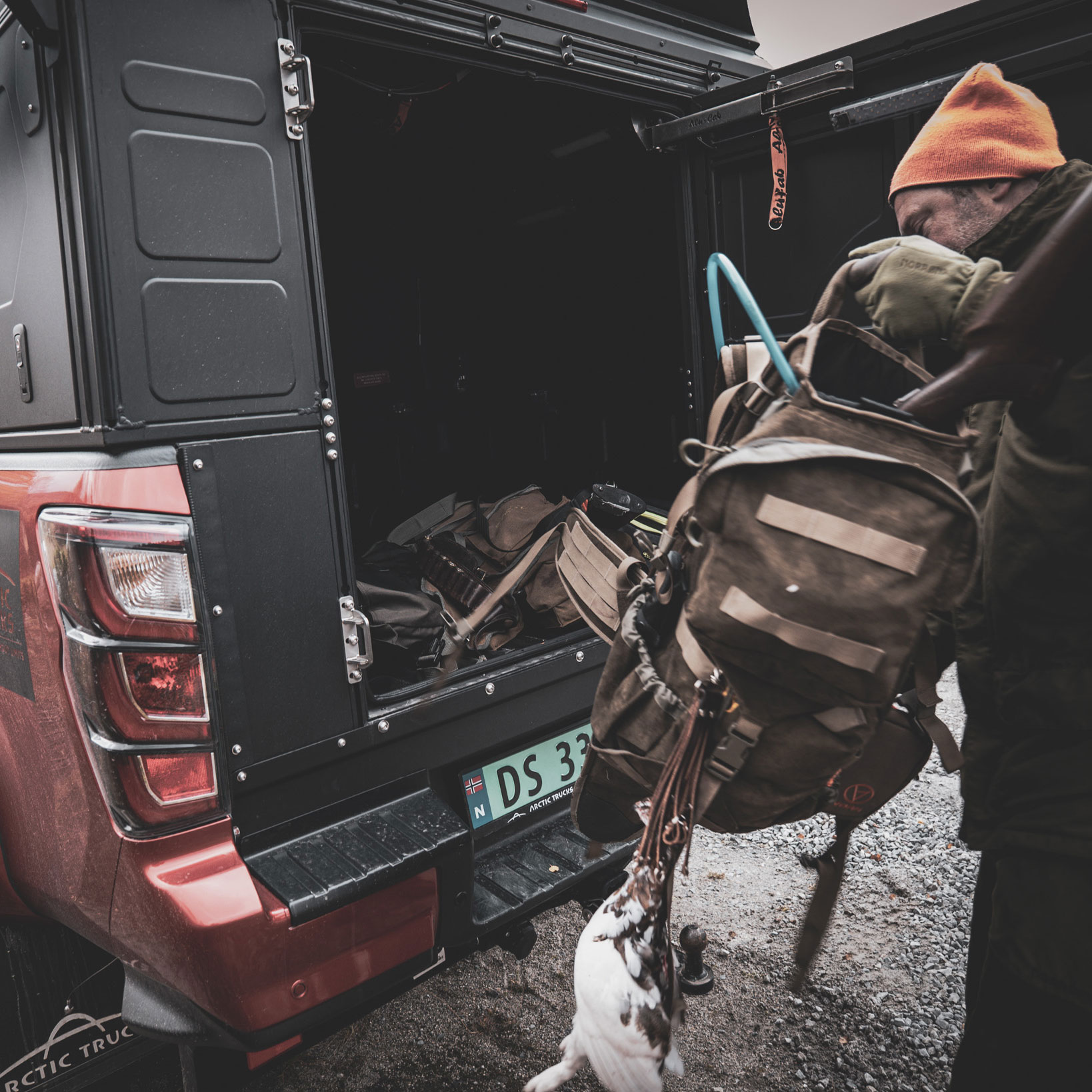 Grytidlige høstdager er ofte kalde og fuktige, og når jaktlaget samles for briefing er det godt å vite hvor de varme klærne ligger når du kommer frem. Bilen har flere funksjoner når du er på tur.
